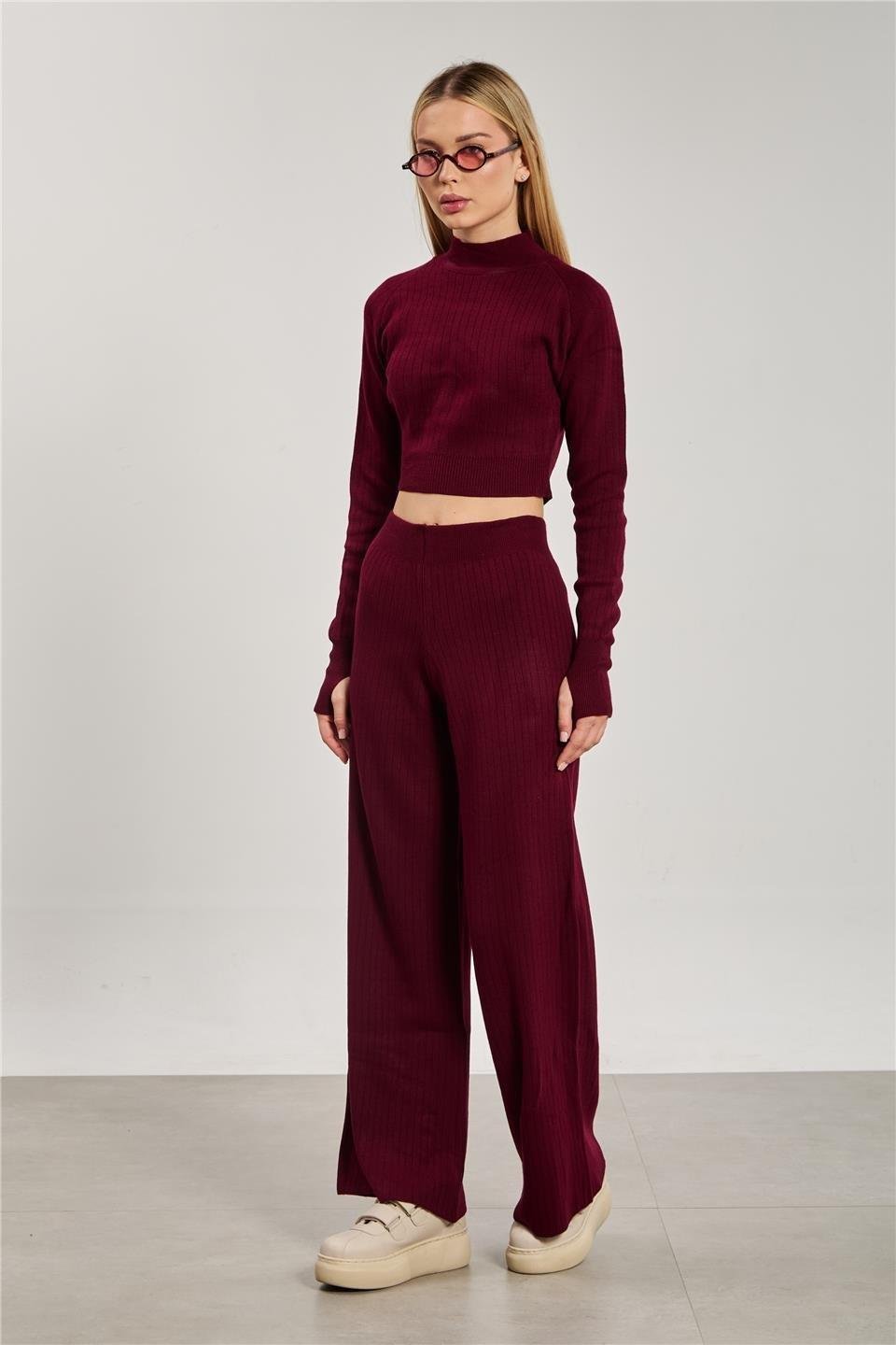 Crop kazak pantolon ikili takım-6478 - Bordo