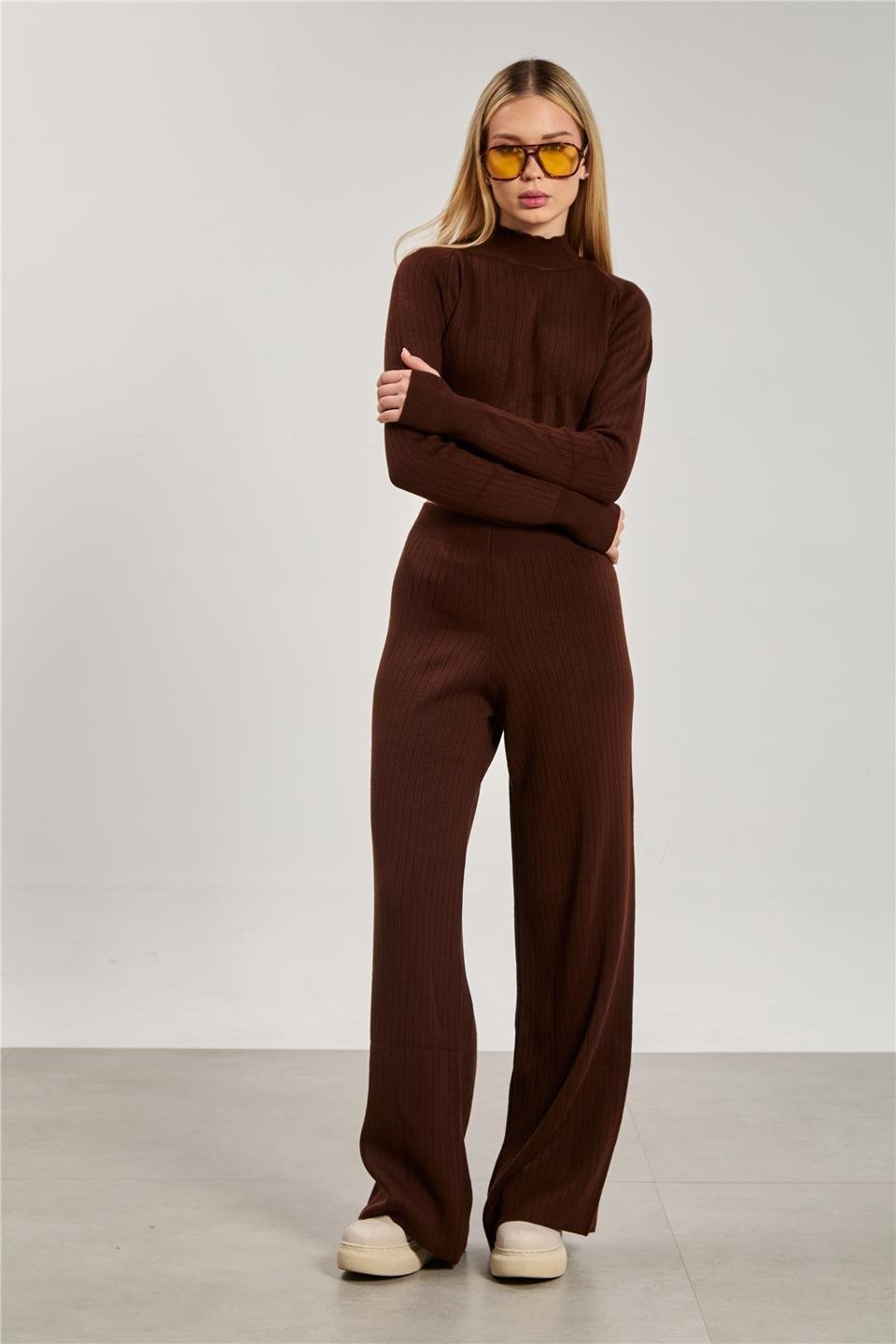 Crop kazak pantolon ikili takım-6478 - Kahve