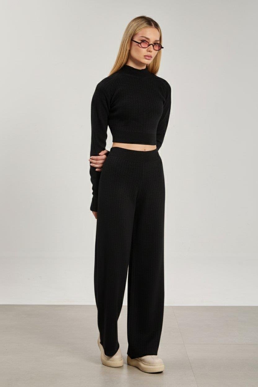 Crop kazak pantolon ikili takım-6478 - Siyah
