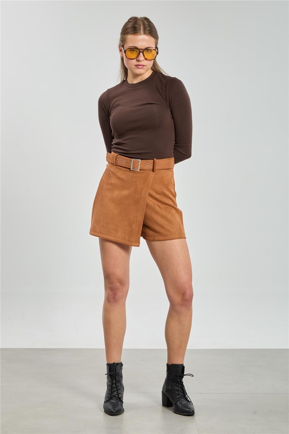 Kemerli süet şort etek-5973 - Taba